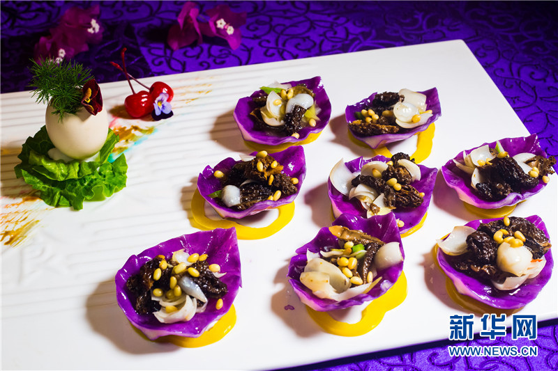 近日,三亞南山新推出用野生羊肚菌和鮮百合制作的名為“紫氣東來(lái)”素菜。新華網(wǎng)發(fā)(陳文武攝)
