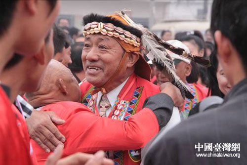 開幕式現場,身著鮮艷民族服裝的臺灣阿里山鄒人部落鄉親一行15人在臺灣少數民族民意代表簡東明的帶領下來到“臺灣村”,探訪300多年前遷居到此的宗親后裔。“臺灣村”村民們穿著節日盛裝列隊歡迎來自海峽對岸的親人。大家相見熱情擁抱,共話同宗之情,祭拜共同的祖先依那思羅夫婦。