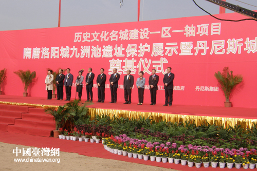 中國臺灣網10月26日洛陽消息 10月25日上午,隋唐洛陽城“一區一軸”區域內重要文物保護展示工程——隋唐洛陽城九洲池遺址保護展示暨丹尼斯城市廣場項目舉行奠基儀式。河南省委常委、洛陽市委書記毛萬春出席并宣布項目開工。洛陽市領導吳中陽、陳向平、黃元元、譚建忠、王敬林、陳衛平及丹尼斯集團董事長王任生等出席奠基儀式。