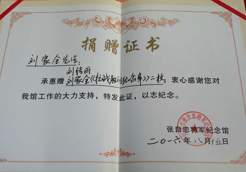 中國臺灣網(wǎng)8月25日宜城訊 8月15日,受臺胞劉家全先生的委托,其侄兒劉正忠專程到宜城市張自忠將軍紀念館,向該館捐贈了兩枚《抗戰(zhàn)勝利紀念章》。一枚是劉家全先生的父親劉傳雨的,一枚是劉家全本人。