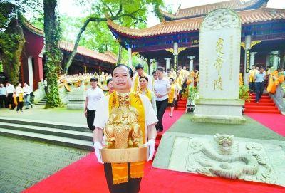 同拜中華始祖,共祈賜福兩岸。6月6日,海峽兩岸各界人士齊聚中華民族始祖炎帝神農(nóng)氏陵寢地——湖南株洲炎陵縣鹿原陂炎帝祖陵大殿,舉行主題為“神農(nóng)賜!砂豆层濉钡摹耙椅茨晟褶r(nóng)大帝祖廟圣駕臺灣巡境賜福”起駕儀式。未來10天,炎帝圣駕將巡境臺灣北、中、南41座神農(nóng)宮廟,為兩岸民眾賜福。