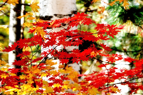 在蛟河、在樺甸……紅楓林、白樺林,紅的嬌艷、白的無暇,深淡相宜,錯落有致,風姿各異,宛如夢幻般的童話世界。