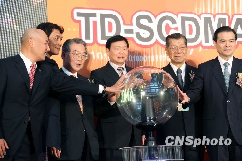 11月24日,中國電子工業(yè)標準化技術(shù)協(xié)會和中國通信標準化協(xié)會名譽理事長婁勤儉(右3),和臺灣金仁寶集團董事長許勝雄(左3)等在臺北共同按下啟動球,宣告臺灣威寶電信“TD-SCDMA試驗網(wǎng)”正式開通。臺灣TD試驗網(wǎng)的開通,是落實海峽兩岸信息產(chǎn)業(yè)技術(shù)標準論壇達成的共識,展示兩岸在第三代移動通信系統(tǒng)TD-SCDMA技術(shù)、研發(fā)和產(chǎn)業(yè)化方面所取得的合作成果。 中新社發(fā) 黃少華 攝