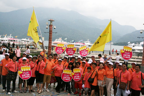 廣東省長黃華華所率領(lǐng)的廣東省經(jīng)貿(mào)文化交流團(tuán),19日抵日月潭游湖,隨行還有廣東旅游團(tuán)游客,他們高舉“臺灣廣東周、萬人游臺灣”招牌在水社碼頭合影。圖片來源:“中央社”