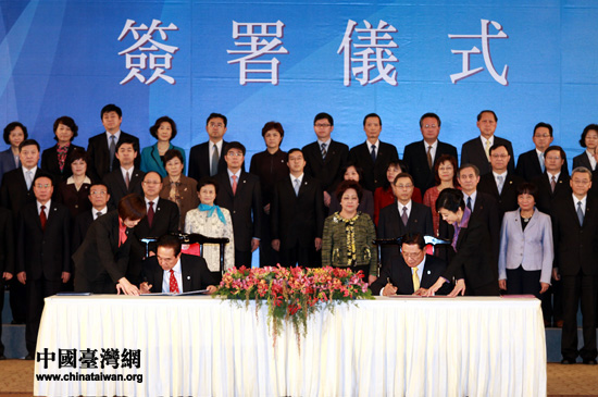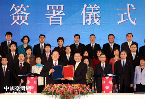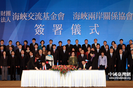 海協會會長陳云林和海基會董事長江丙坤正式簽署《海峽兩岸醫藥衛生合作協議》。(中國臺灣網 鐘寶華 攝)