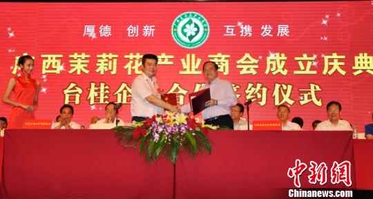 臺桂經貿文化交流協會與廣西茉莉花產業商會8日簽署合作協議,雙方將攜手在世界茉莉花集中產區——廣西南寧市橫縣建立以茉莉花為主題的文化產業基地,打造世界級茉莉花產業和茉莉花文化中心。