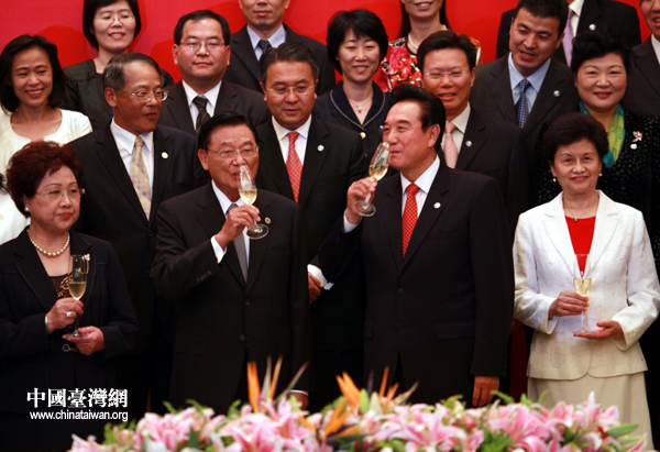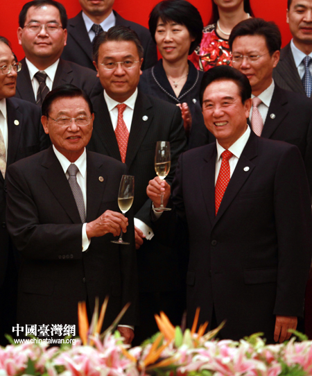 6月29日下午,海協會與臺灣海基會在重慶順利簽署兩岸經濟合作框架協議(ECFA)以及兩岸知識產權保護合作協議。圖為陳云林、江丙坤舉杯互致慶賀。(中國臺灣網 鐘寶華 攝)