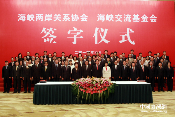 海協會會長陳云林、海基會董事長江丙坤同出席此次商談的兩會代表團成員在簽字儀式上合影留念。(中國臺灣網 鐘寶華 攝)