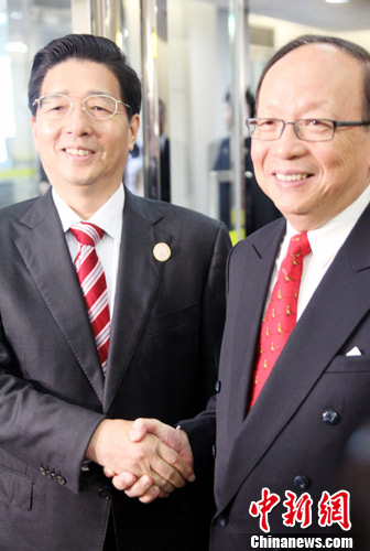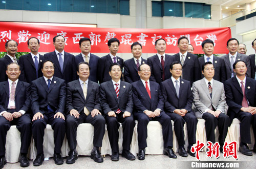 7月1日,應中國國民黨中央委員會邀請,中共廣西壯族自治區黨委書記郭聲琨(中)率廣西經貿文化代表團,乘包機自南寧飛抵臺灣桃園機場,展開為期5天的深化交流合作寶島行。這是兩岸簽署經濟協議ECFA后,第一位訪臺的大陸正省級官員。中新社發 黃少華 攝