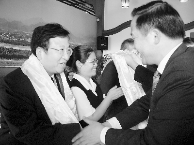 圖為四川方面向臺灣工程界代表(左)敬獻哈達表示感謝,并祝愿吉祥如意,幸福安康。(徐蕾 攝)