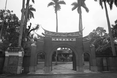 走進嘉義縣中埔鄉社口村,便能遠遠瞧見一道朱紅色的山門,門上鐫刻“阿里山忠王祠”六個大字(如圖),旁邊畫著4只蝙蝠,寓意著賜福給進出山門的人。而這個紅磚砌起的山門通過高低不一的圍墻把五鳳廟建筑連接起來。當地鄉民告訴記者,這里便是聞名兩岸的臺灣古跡吳鳳廟。