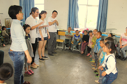 愛心人士與學校幼兒園小朋友做游戲。