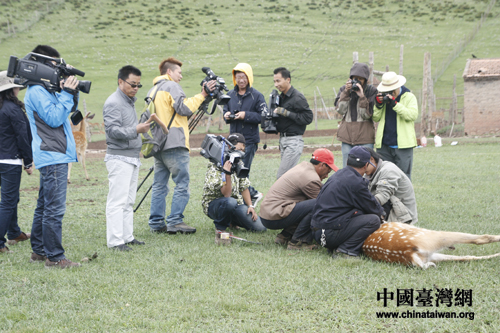 兩岸媒體記者在祁連山半野生鹿業(yè)基地實(shí)拍割鹿茸(中國臺(tái)灣網(wǎng) 陳寧 攝)