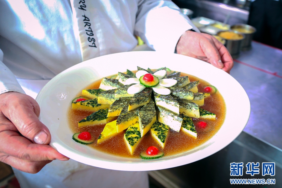 范增福正在細心地擺盤!叭P的制作非常講究,拼盤的食材都要切得整齊劃一,擺出來才最好看!狈对龈Uf。