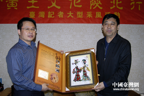 陜西省臺辦主任閆超英向臺灣媒體贈送禮物。(中國臺灣網 董潔 攝)