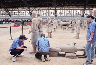研究團(tuán)隊(duì)在兵馬俑一號(hào)坑現(xiàn)場開展分析工作(資料圖片)