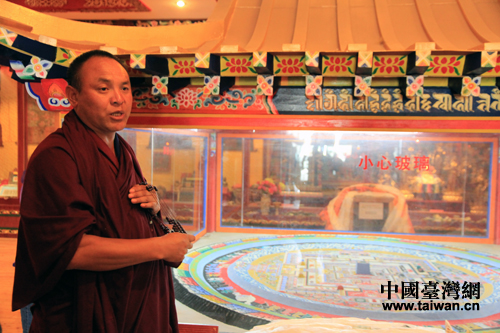 達(dá)扎書(shū)院副院長(zhǎng)尕哇降措在介紹書(shū)院藏品。(中國(guó)臺(tái)灣網(wǎng) 馬迪 攝)