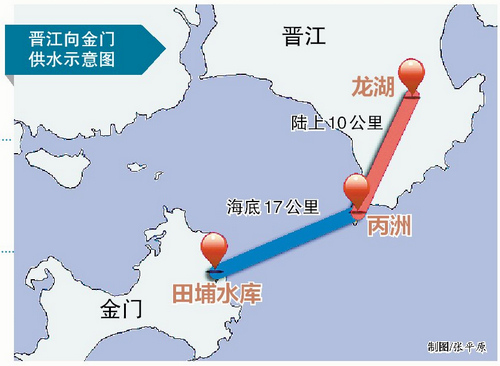 福建向金門供水工程水源取自泉州市晉江流域,由晉江金雞攔河閘引水至晉江市龍湖水庫,經龍湖抽水泵站抽水輸水至圍頭入海點,再經海底管道輸送至金門,輸水線路總長27.56公里,其中福建方面陸地管道11.6公里、海底管道15.76公里,金門方面陸地管道0.2公里,工程總投資3.878億元。福建方面負責龍湖取水泵站、龍湖水庫至丙洲入海點的供水設施建設,金門方面負責從丙洲入海點至田埔水庫的購水設施建設,即海底管線由金門方全段出資、建設和營運。工程設計日供水規模3.4萬立方米,通水后,福建將按計劃每天24小時連續供水。目前,大陸段已完成投資1.1億元,占大陸段工程總投資的87.8%。