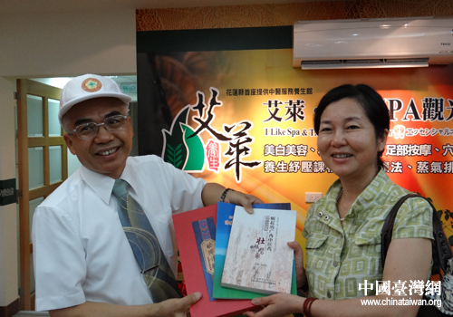 廣西衛(wèi)生廳副廳長(zhǎng)夏寧(右)向花蓮觀光養(yǎng)生館相關(guān)負(fù)責(zé)人贈(zèng)送近年來廣西醫(yī)藥著作成果。(圖片來源:廣西臺(tái)辦)