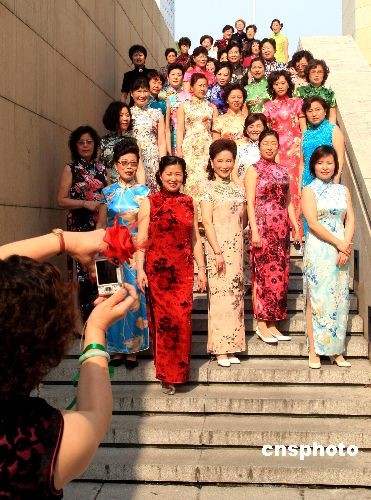 上海“旗袍沙龍”是一個民間組織,創始人是汪薇玉,兩年前成立時有四十五名成員,如今已擴展到二百五十多人,其中還有幾位外國人。她們是一群因旗袍結緣的姐妹,平均年齡在五十五歲左右。成員們身穿旗袍,每周都要聚一聚,學習站姿、坐姿,學習用餐禮儀等,走走步子,展示旗袍的獨特美麗。