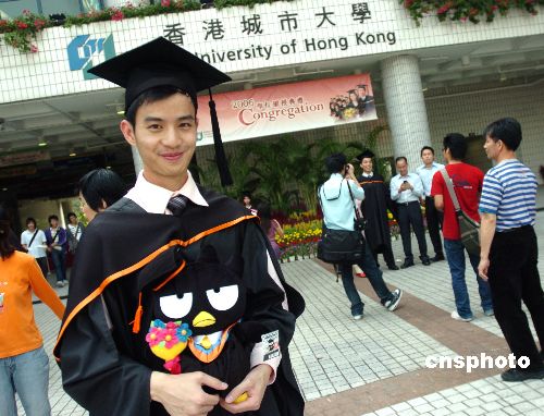 香港城市大學(xué)11月10日舉行2006學(xué)位頒授典禮﹐校園四處有獲得學(xué)位的畢業(yè)生一身學(xué)位服打扮留影﹐父母親戚左右相伴﹑鮮花相送﹐學(xué)生們個(gè)個(gè)展露開心笑容。資料顯示﹐香港大學(xué)生就業(yè)職位數(shù)目較去年同期上升近12%。圖中一位會(huì)計(jì)科系畢業(yè)的學(xué)生懷抱卡通娃照相。 中新社發(fā) 王麗南 攝