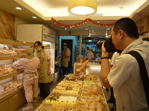 采訪臺北市喜憨兒社會福利采訪團的記者在采訪心智障礙者訓練場面包烘培房