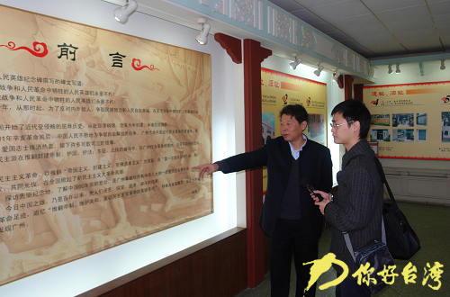 廣州中山紀念堂管理處錢曉清書記向本網記者介紹圖片展情況(你好臺灣網 黃永波 鐘智躍 攝)