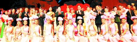 本報(bào)臺(tái)北訊 (記者王大慶)12月15日晚,能夠容納2500人的臺(tái)北中山紀(jì)念館座無(wú)虛席,大型樂(lè)舞《河洛風(fēng)》在這里精彩上演。中共中央委員、河南省委原書(shū)記、省人大常委會(huì)主任徐光春,省委常委、宣傳部長(zhǎng)、副省長(zhǎng)孔玉芳,省委常委、秘書(shū)長(zhǎng)曹維新出席,中國(guó)國(guó)民黨副主席曾永權(quán)夫婦,臺(tái)北世貿(mào)中心董事長(zhǎng)王志剛夫婦、國(guó)民黨副秘書(shū)長(zhǎng)張榮恭夫婦應(yīng)邀觀看演出。