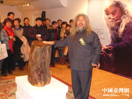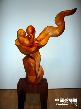 開幕式上,康木祥為來賓介紹了用紅檜、梢楠、牛樟等木材雕刻而成的“圣嬰”、“向上”、“深情”、“母子”、“良緣”等作品。這些作品雖形態各異,但有一個共同特點,就是充分利用樹木的形狀、裂縫、紋理,盡情展示生命的最初形態和原始美感。在介紹到作品“包容”時,康木祥說,這是他迄今為止難度系數最大的一件作品,在創作過程中,手被敲傷、割破多次。說這番話時,他的臉上露出淡然的微笑。