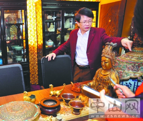 葉燈輝在自己的收藏館里介紹他的收藏品。中山商報記者明劍攝