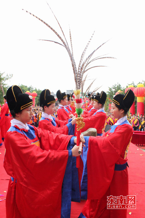 上午10時許,兩岸宗親共祭閩王大典在鐘鼓齊鳴聲中正式開始。2列古裝儀仗隊沿著石階緩緩而上,臺灣王氏宗親代表王珠慶作為主祭人,手持香火,率領身著漢裝的海峽兩岸王氏宗親,在閩王金身前開始隆重的各項祭祀程序:盥洗上香、獻三牲五谷、行初獻禮、讀祝文……