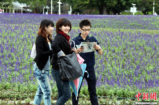 首日趕來嘗鮮的參觀者,十分鐘情園內多處大面積的“花海”造景。中新社發 王健 攝