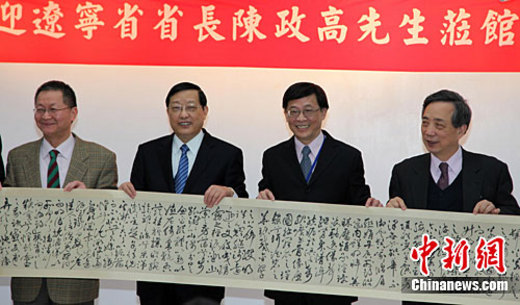 2月17日,正在臺(tái)灣參訪的遼寧省省長(zhǎng)陳政高(左二)一行來到臺(tái)北歷史博物館參觀訪問,圖為陳政高向臺(tái)北歷史博物館館長(zhǎng)張譽(yù)騰(右二)等贈(zèng)送長(zhǎng)卷書法作品。中新社記者 符永康 攝