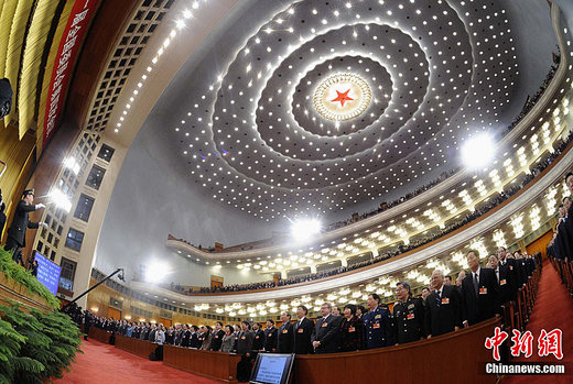 3月3日下午,全國政協十一屆四次會議在北京人民大會堂開幕。圖為大會開幕時全體參會者高唱國歌。中新社發 廖攀 攝