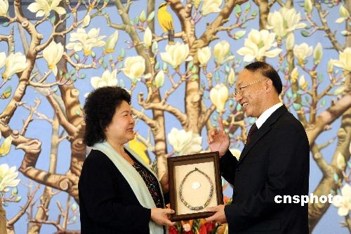 資料圖:2009年5月22日,國家體育總局局長劉鵬在北京飯店會見高雄市長陳菊時,陳菊向劉鵬贈送臺灣原住民首飾禮品。 中新社發 廖攀 攝