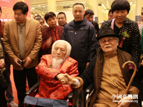 臺灣中華書院院長李奇茂(右)、著名書畫大師孫大石(左)出席開幕式。(圖片來源:山東省臺辦)