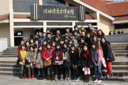 兩岸學子在河姆渡遺址博物館前合影留念。(中國臺灣網 郭瑩瑩 攝)