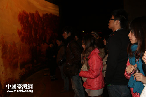 兩岸大學生們認真觀看新石器時期河姆渡人的生活還原圖。(中國臺灣網 郭瑩瑩 攝)