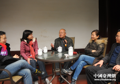 四川知名學者袁庭棟教授(中)向臺灣中華聯(lián)合青年議事協(xié)會參訪團一行作巴蜀文化講座。(圖片來源:四川省臺辦)