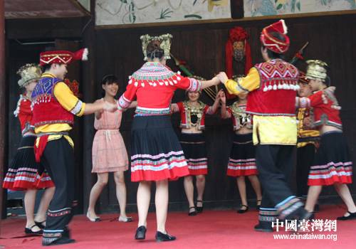 臺灣非凡電視臺記者與廣西少數民族進行互動表演。(圖片來源:廣西臺辦)