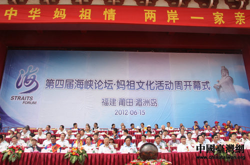中國(guó)臺(tái)灣網(wǎng)6月15日莆田消息 以“中華馬祖情、兩岸一家親”為主題的第四屆海峽論壇·媽祖文化活動(dòng)周于今日上午在湄洲島天后廣場(chǎng)舉行開幕式。本屆媽祖文化活動(dòng)周以全國(guó)臺(tái)聯(lián)為指導(dǎo)單位,由莆田市人民政府、福建省臺(tái)辦、福建省臺(tái)聯(lián)共同主辦。莆田市政協(xié)主席林慶生主持了開幕式,莆田市長(zhǎng)梁建勇致歡迎詞,中華媽祖文化交流協(xié)會(huì)副會(huì)長(zhǎng)兼秘書長(zhǎng)、湄洲媽祖祖廟董事長(zhǎng)林金榜及臺(tái)灣媽祖宮廟代表蔡詠锝致辭。在開幕式上,全國(guó)臺(tái)聯(lián)主席梁國(guó)揚(yáng)等四位嘉賓共同啟動(dòng)“第四屆海峽論壇·媽祖文化活動(dòng)周”開幕按鈕。