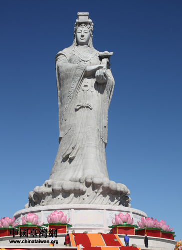 中國臺灣網9月28日天津消息 28日,天津濱海媽祖圣像落成安坐大典在天津濱海新區隆重舉行,兩岸四地上千名媽祖信眾參加落成大典。媽祖圣像高42.3米,為目前世界最高,相當于矗立一座14層樓,采用大理石和鋼筋混凝土鑄造,由858塊巨石拼接而成,氣勢恢宏,雄偉壯觀。
