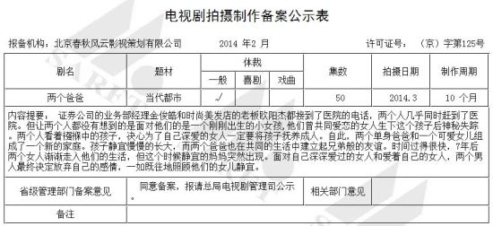 3月13日下午,@湖南衛視芒果撈微博爆料稱:“才播完不到一年的《兩個爸爸》就要被內地翻拍了,由出品過《流星雨》系列的北京春秋風云影視策劃有限公司報備……”并上傳“電視劇拍攝制作備案公示表”。此消息曝光后,網友大規模提議劇中的爸比和爹地分別由張亮和田亮來出演,森碟演女兒。