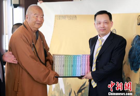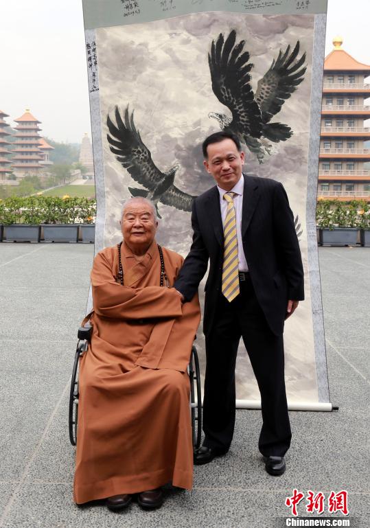 東盟-中國書畫家協(xié)會榮譽(yù)主席、大陸著名書畫家君壽12日來到高雄佛光山佛陀紀(jì)念館,拜會佛光山開山宗長星云大師,并將其歷時一年所完成長六米、寬一點(diǎn)五米的巨幅畫作《佛光普照金色荷塘》圖,贈予大師。星云則以《百年佛緣》系列叢書回贈。