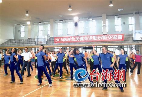 昨日,2015兩岸全民健身活動示范交流會在臺北弘道中學舉行,兩岸健身人才輪番上臺表演拿手好戲。大陸代表們第一個展示的節目便是廣場舞《活力綻放》,最后又以一曲激情四射的《小蘋果》力邀“臺灣大媽”上臺共舞。被大陸坊間稱為“廣場舞男神”的《小蘋果》編舞者王廣成,站在隊伍最中間領跳,全場氣氛十分火爆。
