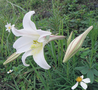 臺灣百合類似鐵炮百合,最大的差別在于葉片,鐵炮較短胖,外花瓣也有差異,鐵炮是純白色,臺灣百合有紫紅色線條。百合的花季每年4至9月,因地形與氣候不同,花開時間有些許誤差。
