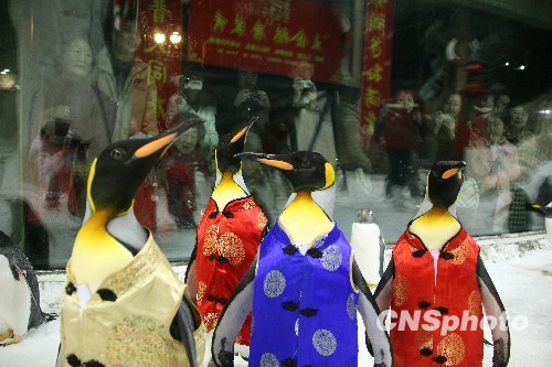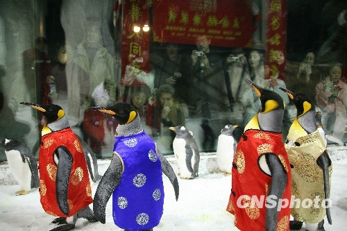 企鵝穿唐裝鬧新春。中新社發 陳浩浩 攝