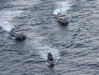 臺灣保釣船野柳籍“感恩九十九號”(中)十四日凌晨在釣魚島附近海域,遭到日本海上保安廳兩艘船艦包夾驅離。