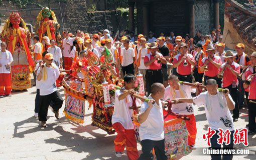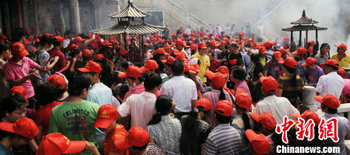 隨著媽祖羽化升天紀念日臨近,前往福建莆田湄洲媽祖祖廟謁祖進香的海內外媽祖信眾絡繹不絕。圖為廣東中山市瞻部洲勝母宮600多位媽祖信眾組成謁祖進香團,恭請100多尊神像到湄洲媽祖祖廟謁祖進香,該進香隊伍人員都是在廣東辦廠經商的臺胞。高亞成 攝