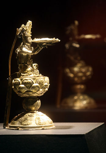 “盛世皇朝秘寶─法門寺地宮與大唐文物特展”28日在臺北歷史博物館舉行開幕記者會,展品中超過一半是大陸1級文物。圖為敬獻佛指舍利的捧真身菩薩。 圖片來源:“中央社”